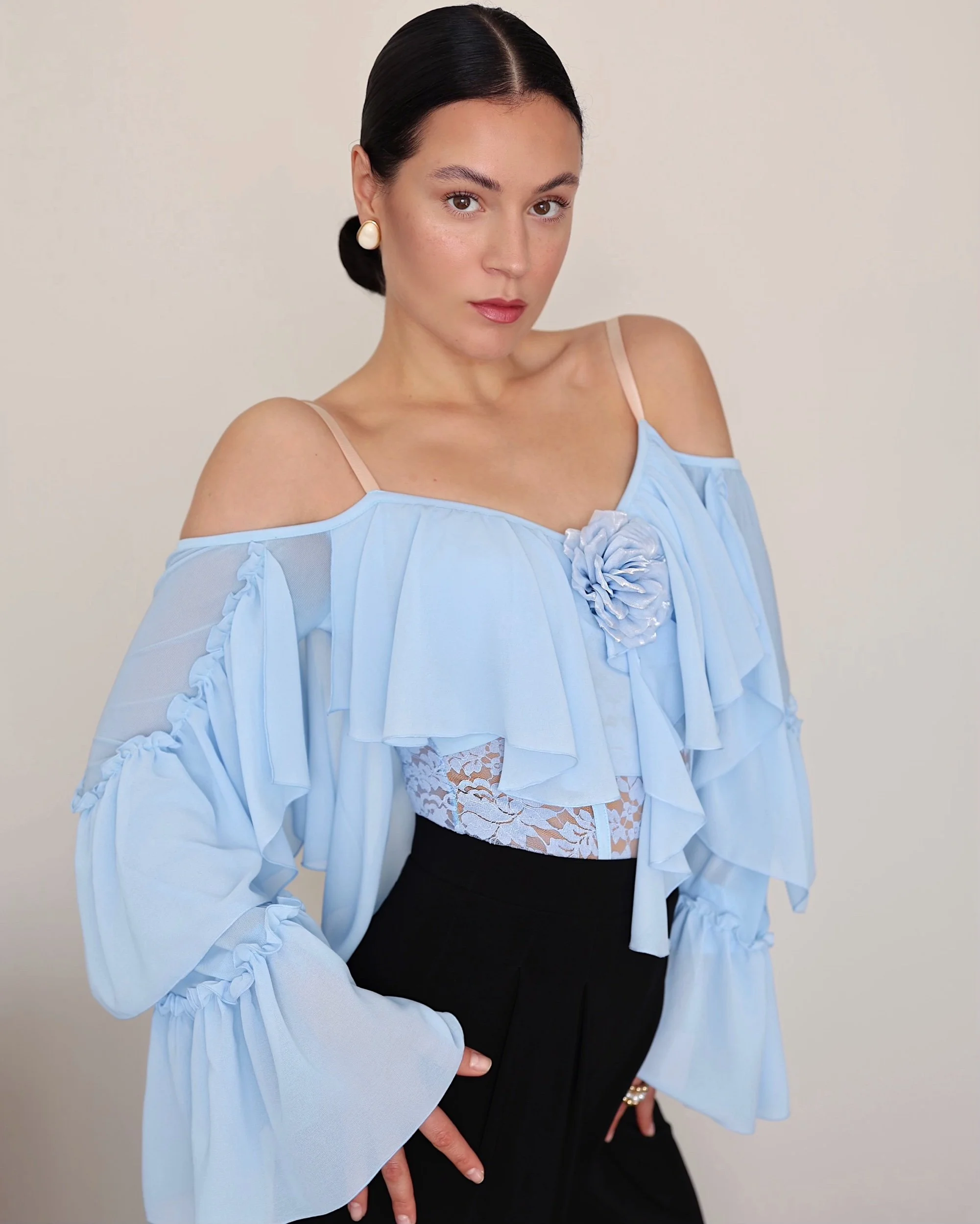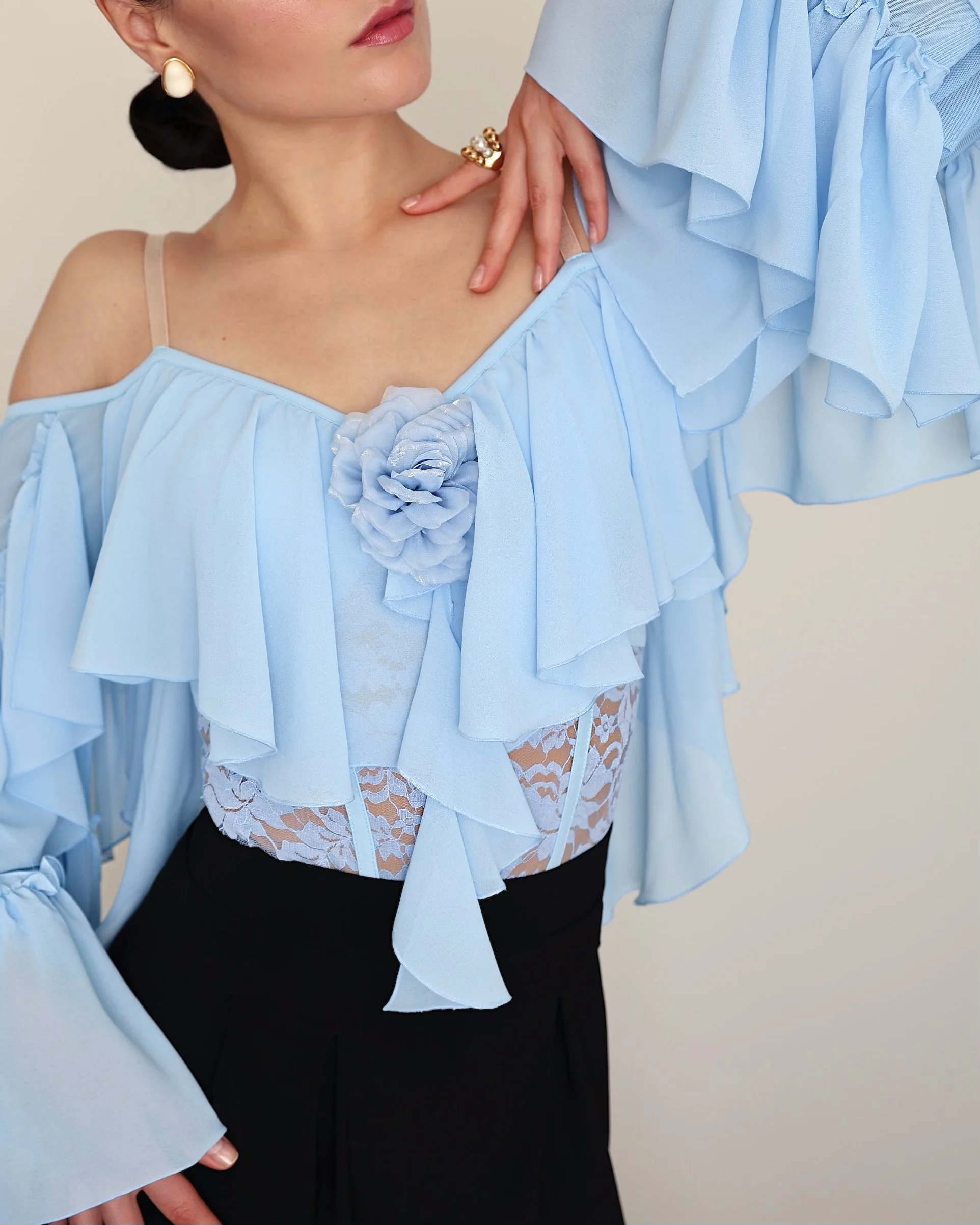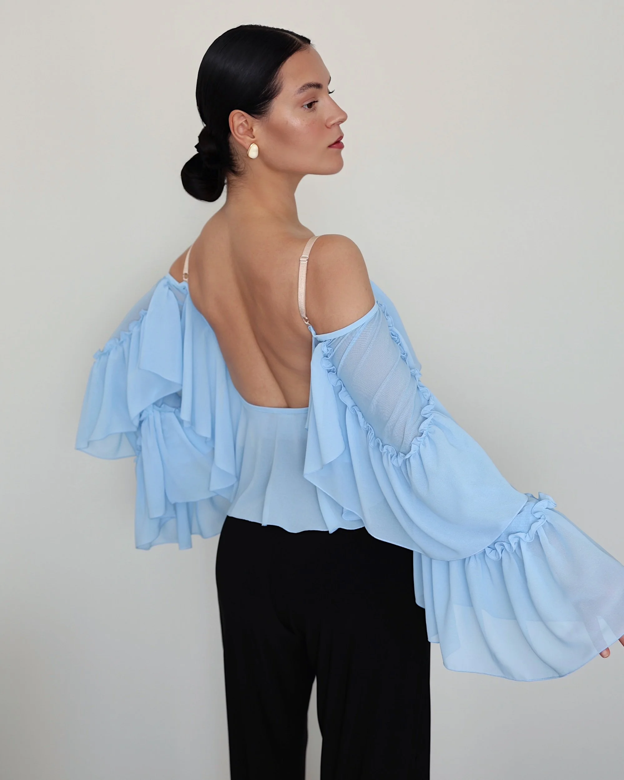 Long flared chiffon sleeves with gathered detailing
