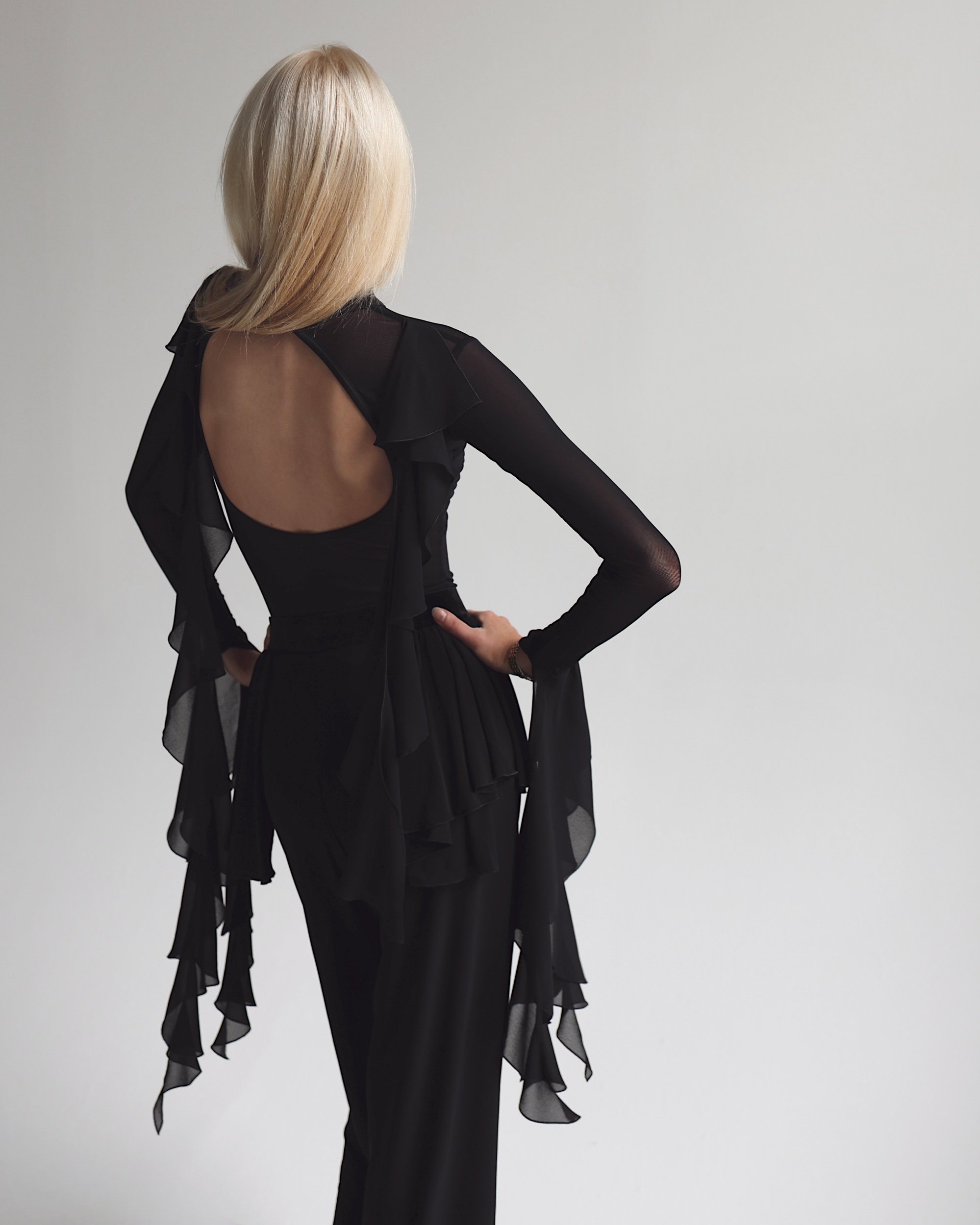 Long fitted sleeves finished with flowing layered chiffon tails