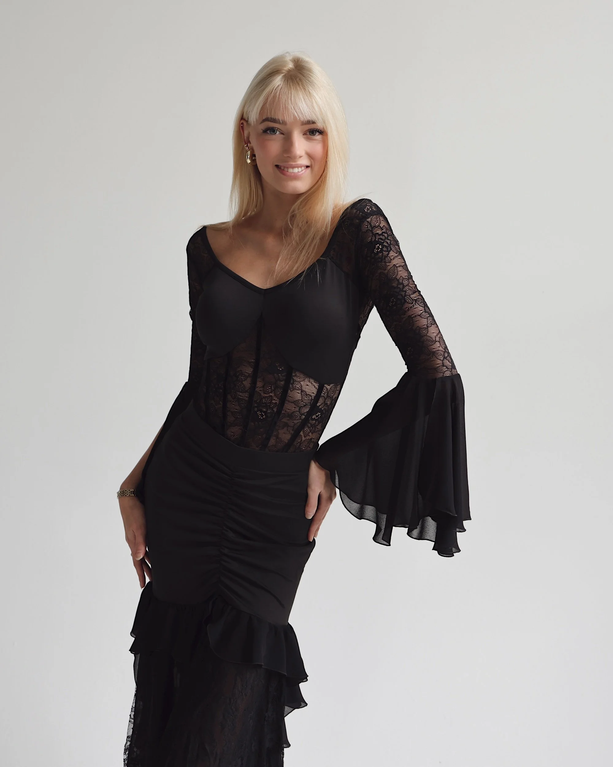 Sheer lace body with vertical velvet contour lines that elongate the figure