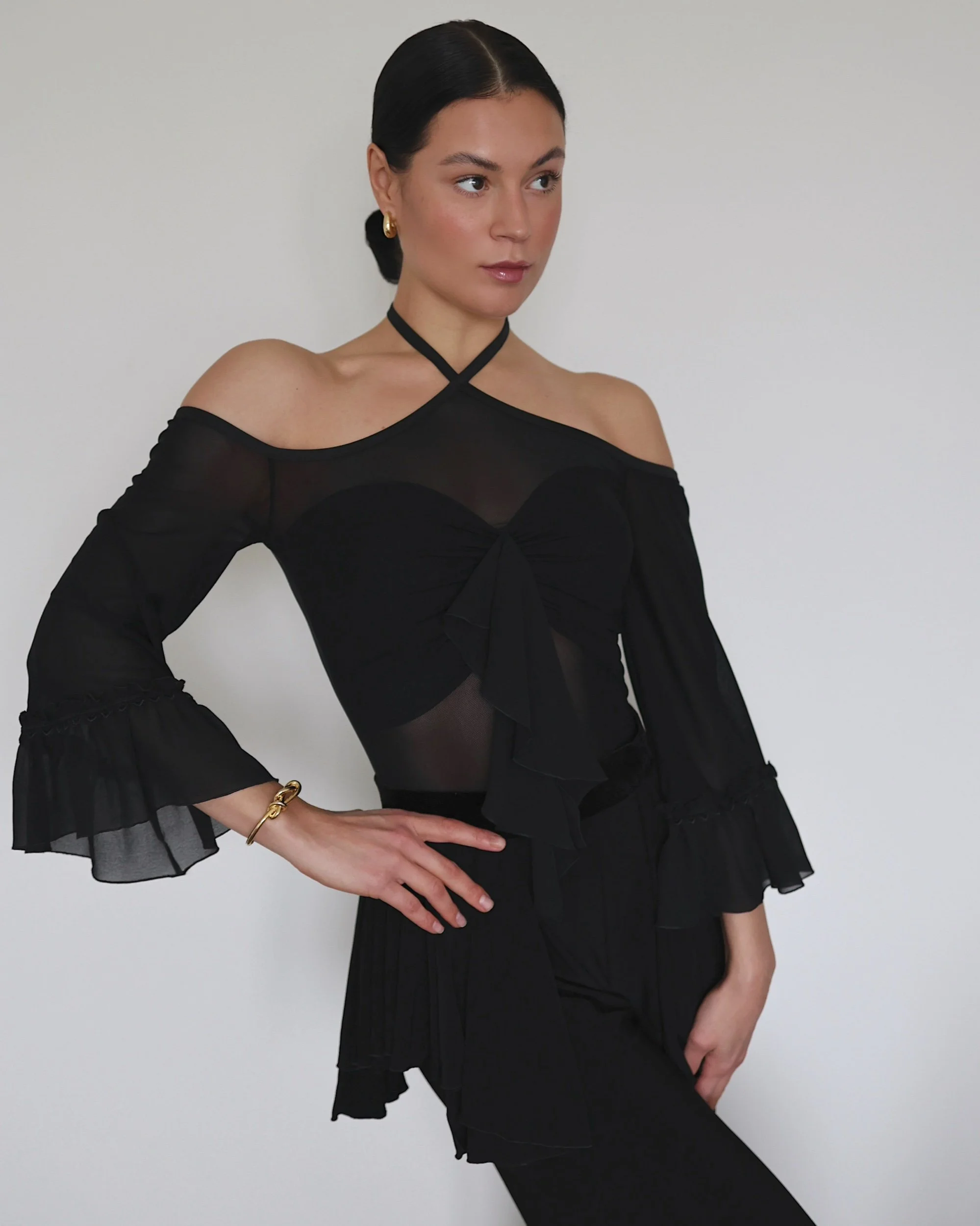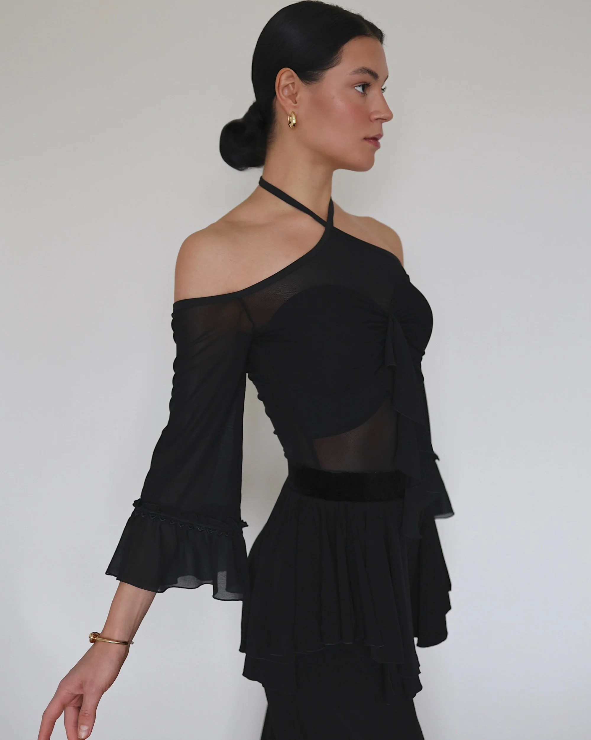 Flared mesh sleeves with subtle ruffle hem