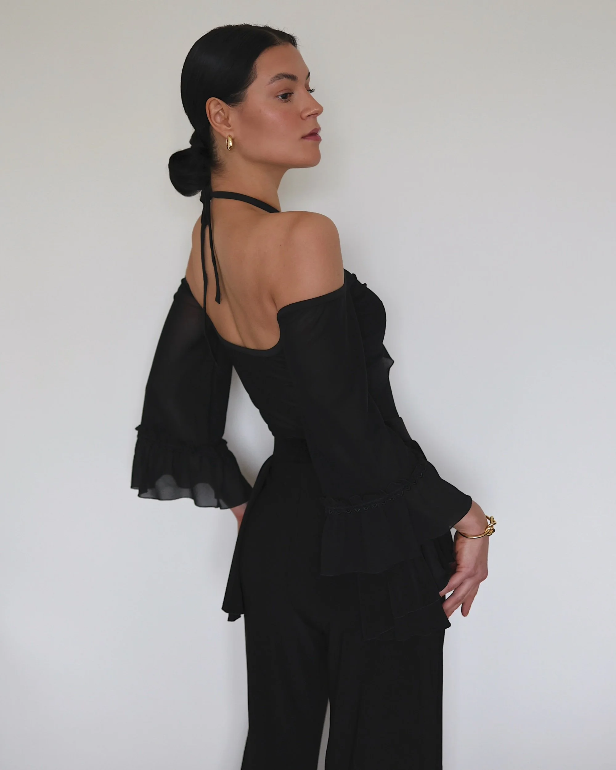 Off-shoulder silhouette with thin halter tie