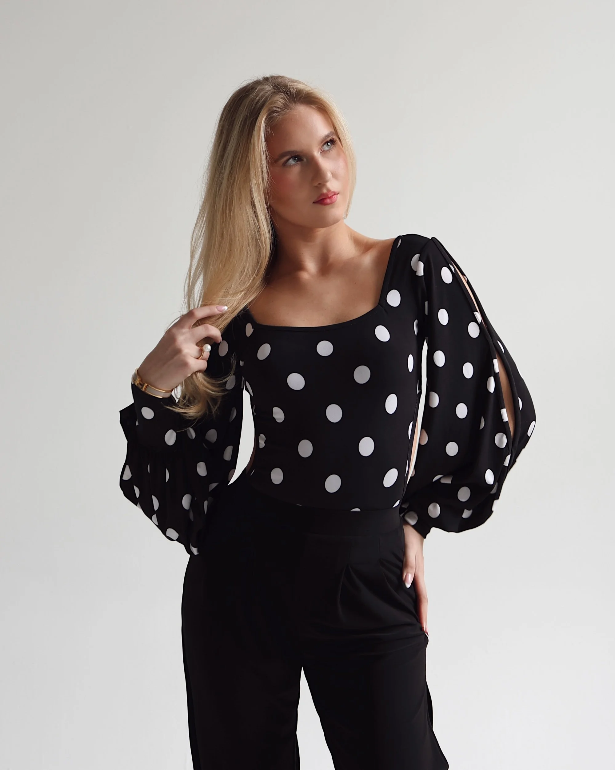 Statement voluminous sleeves with elegant slits along the arms and gathered cuffs