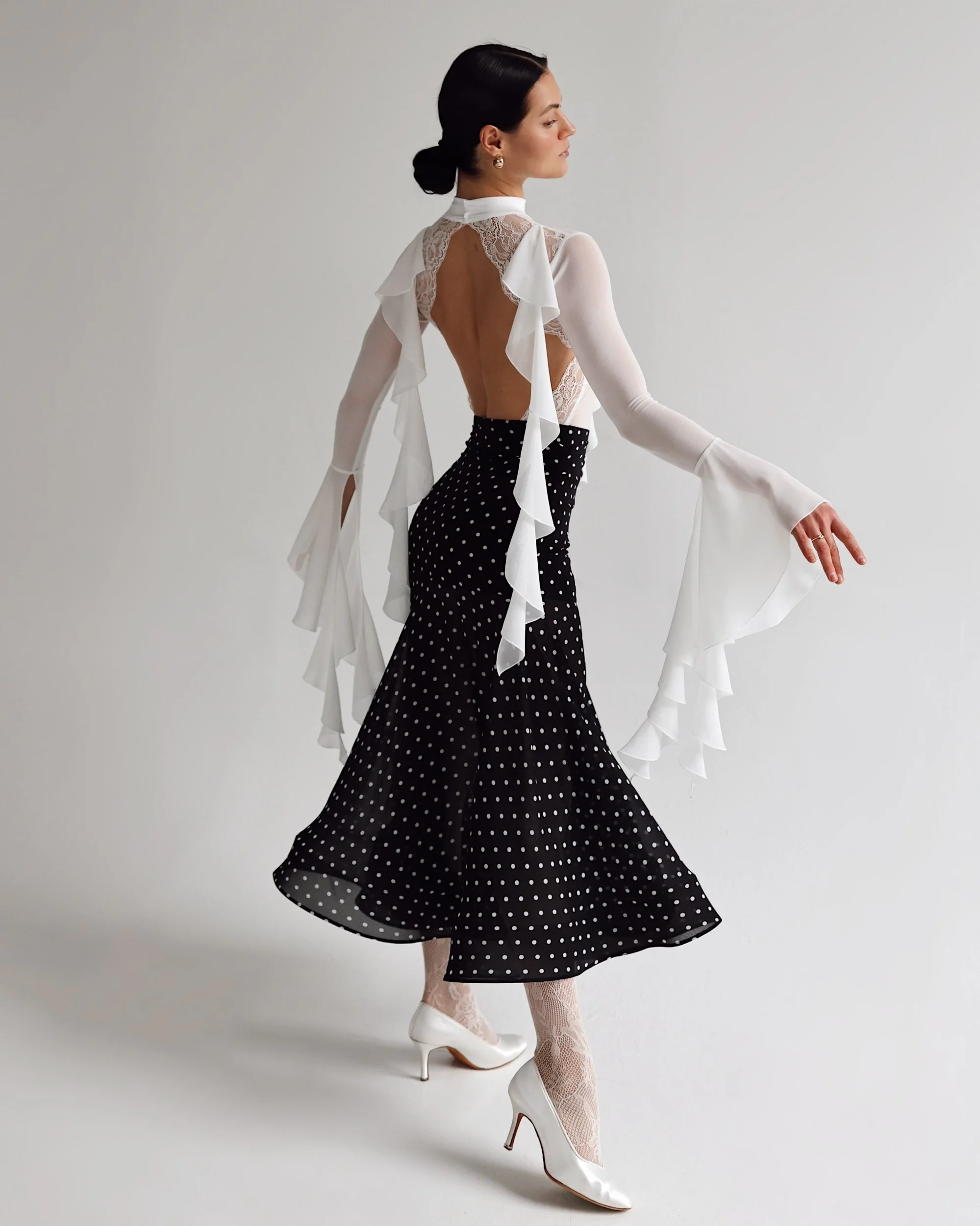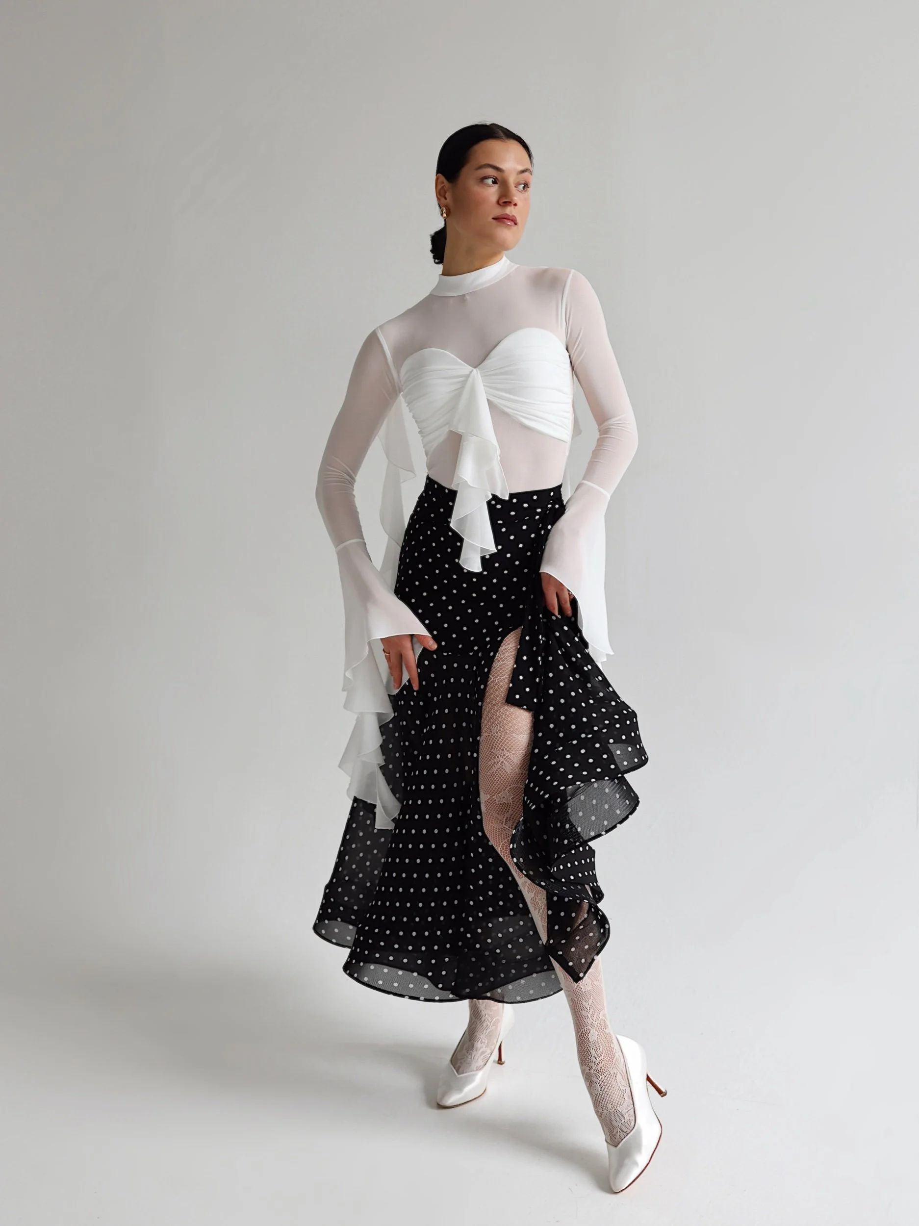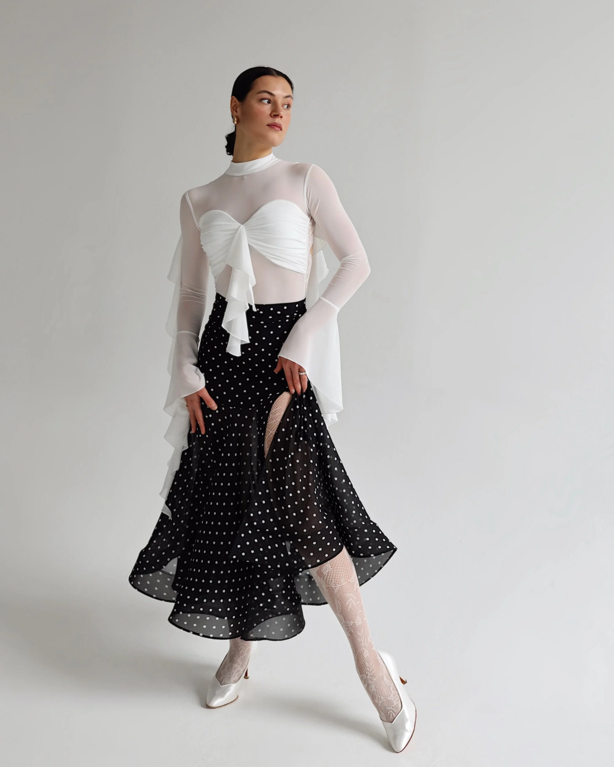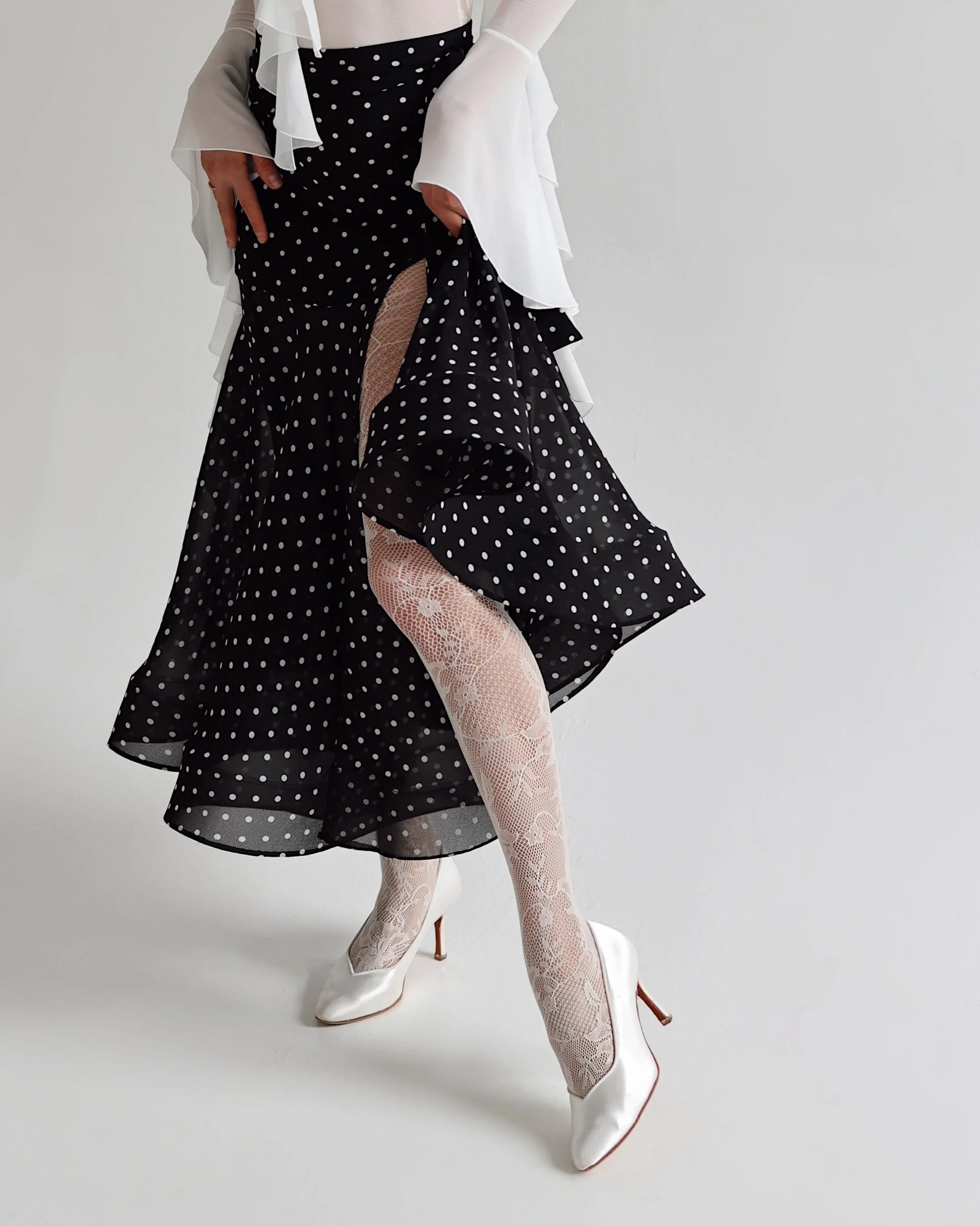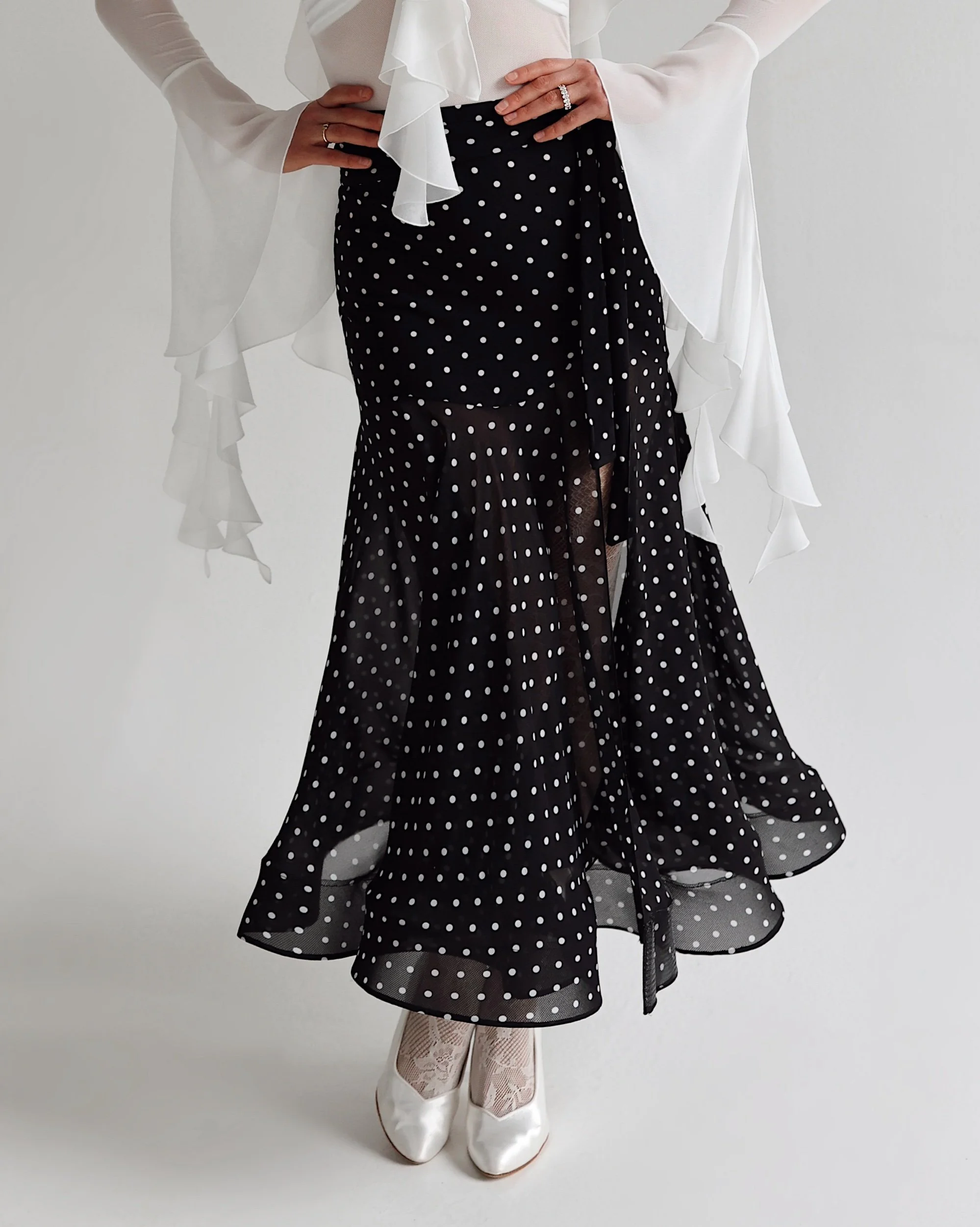 Lightweight chiffon fabric with delicate white polka dot pattern