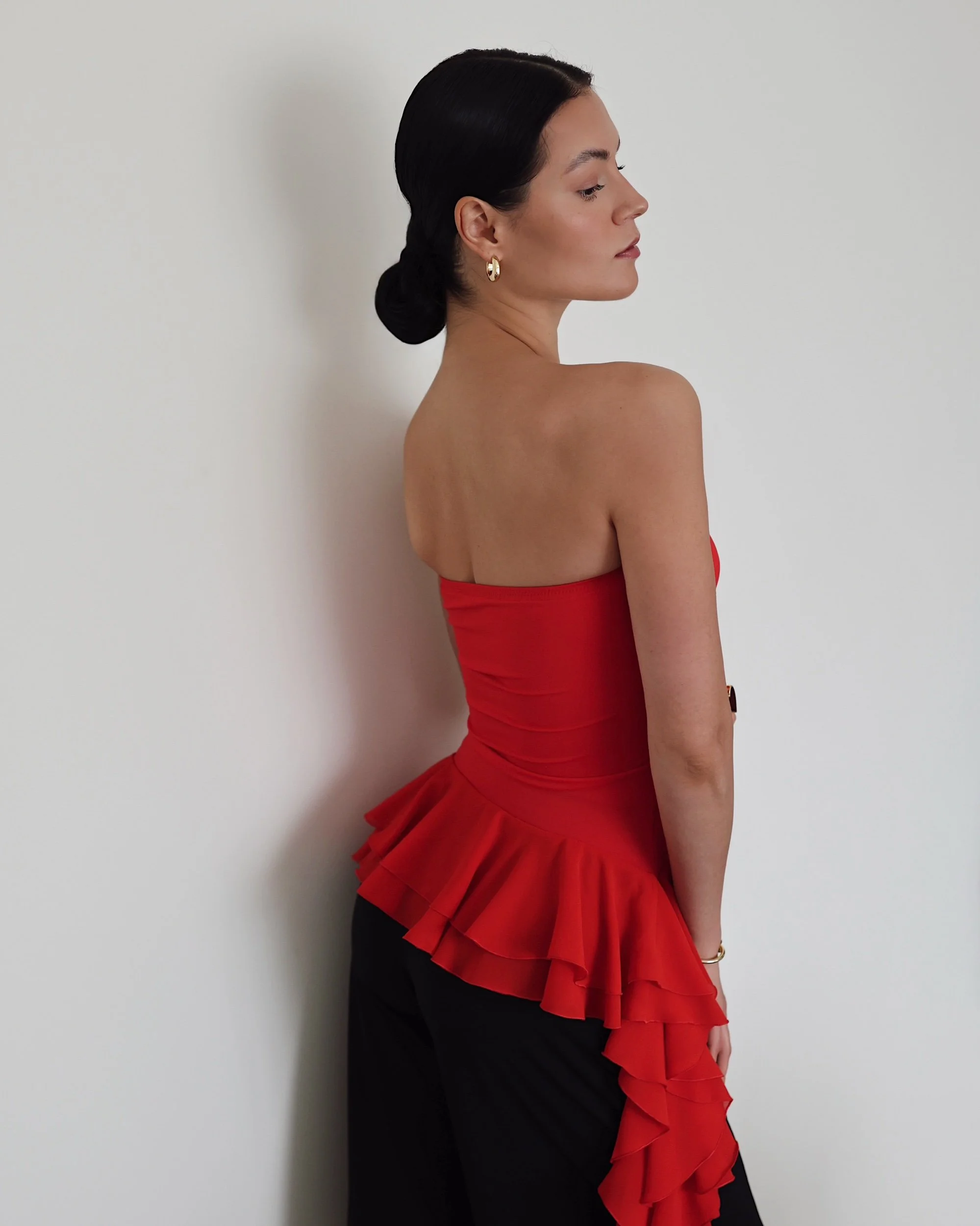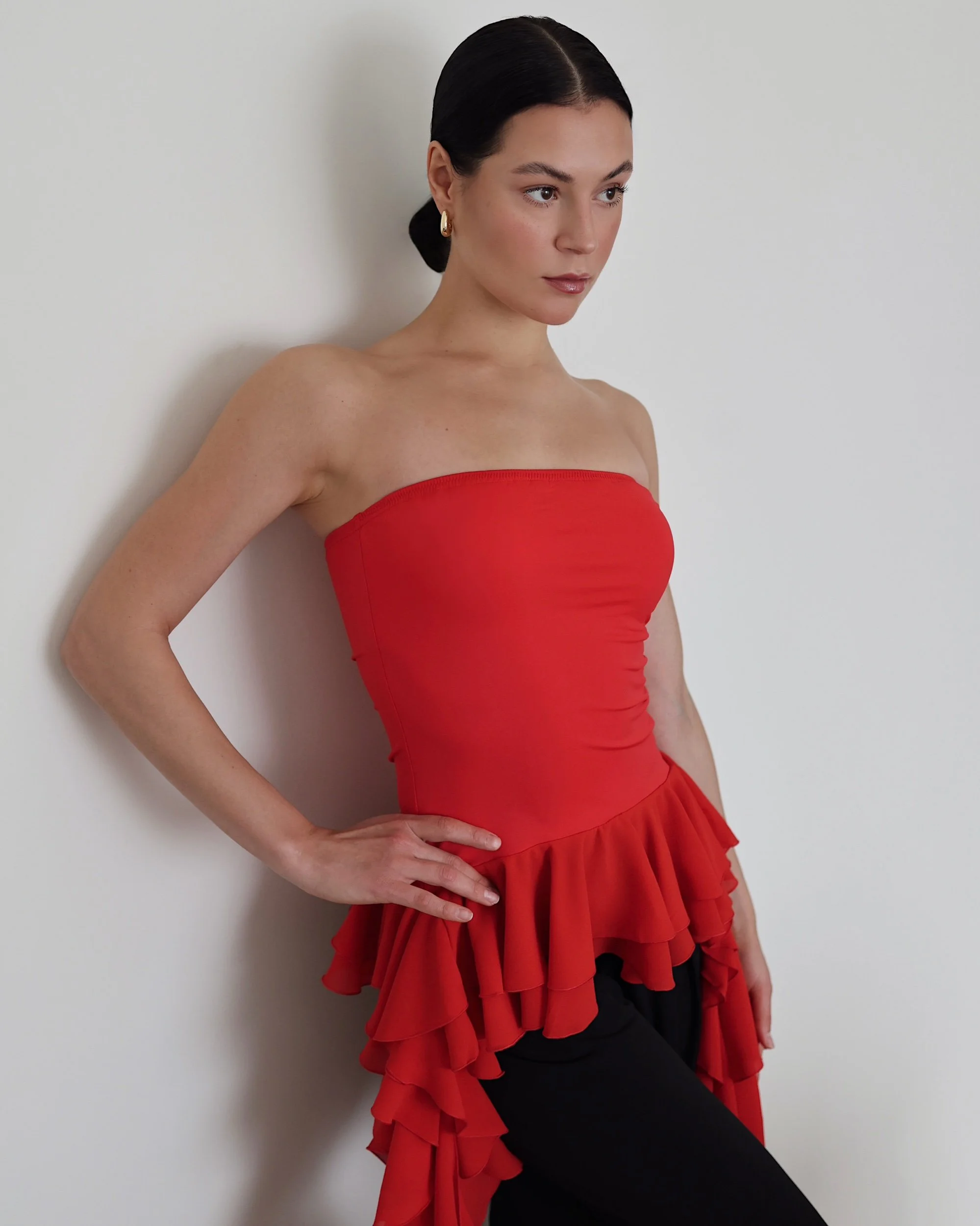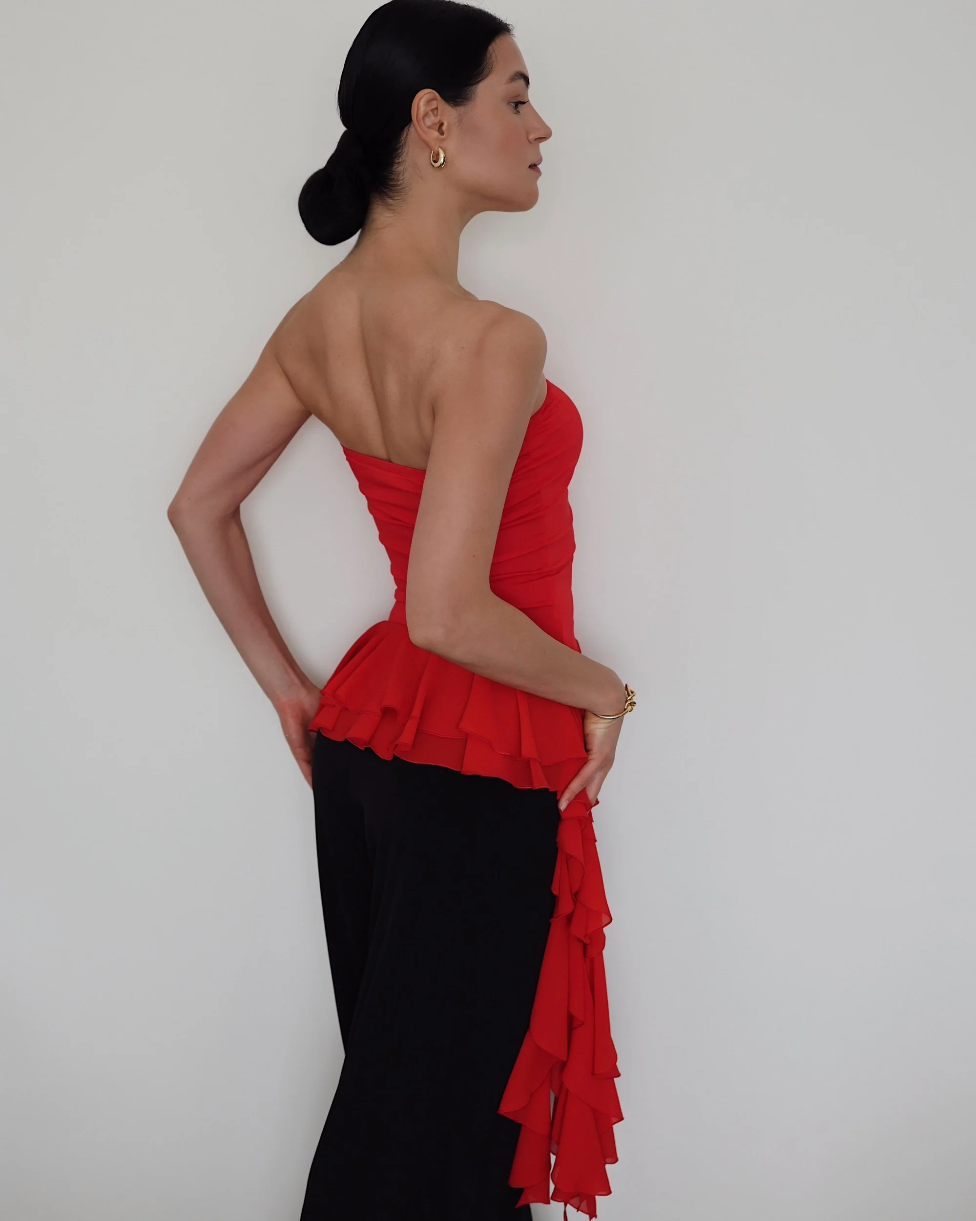 Cascading chiffon ruffles creating an asymmetric waterfall effect
