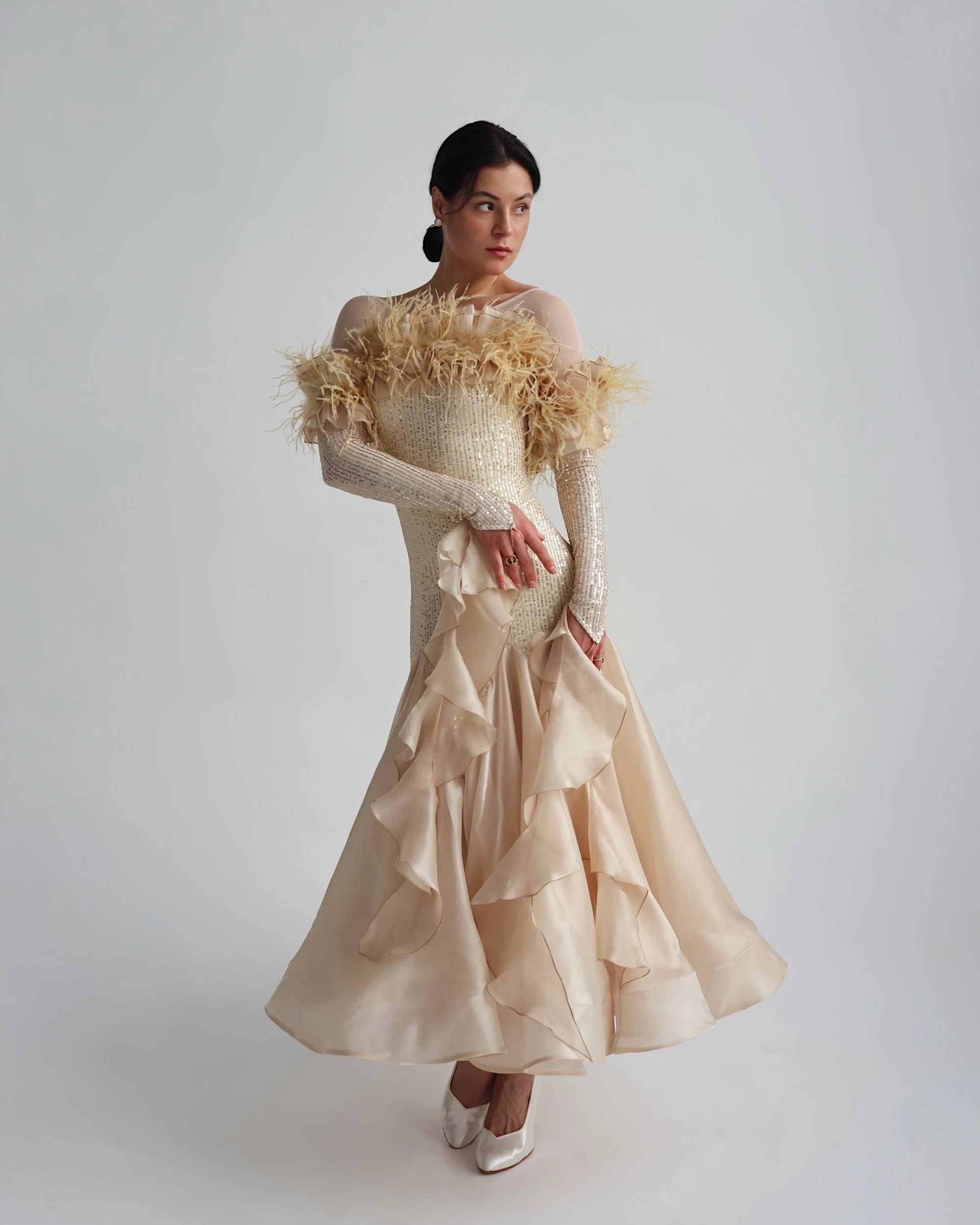 • Off-shoulder neckline with feather trim detail