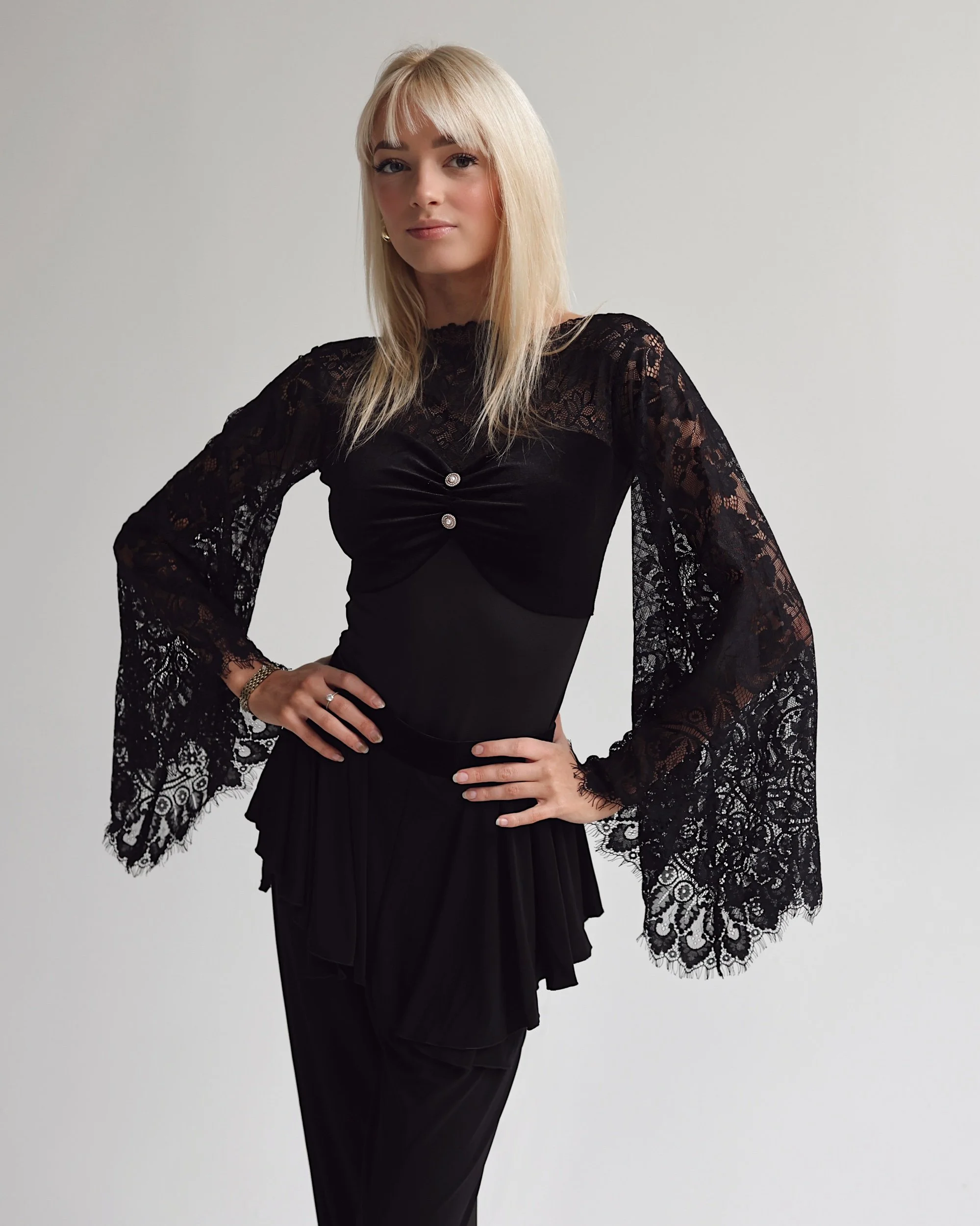 Semi-sheer lace neckline and dramatic bell sleeves with scalloped edges